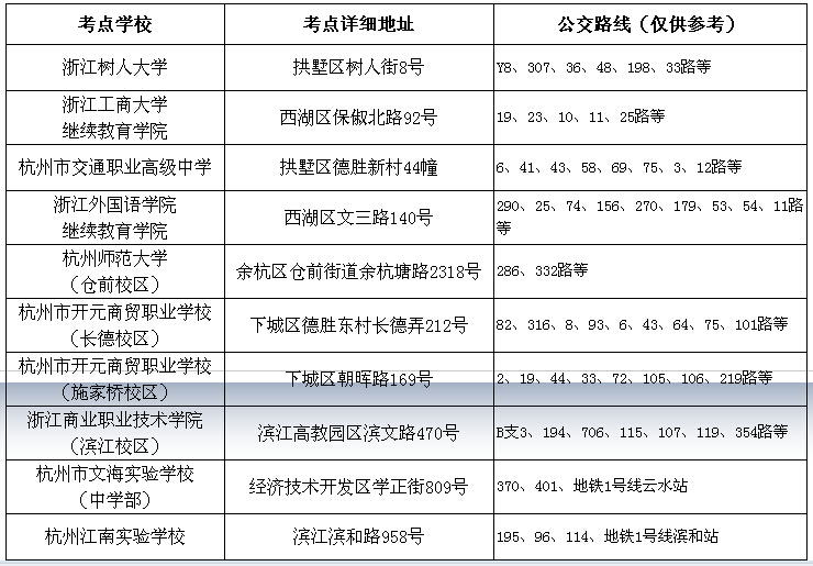杭州考区考点地址与公交信息
