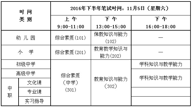 浙江省2016年下半年全国中小学教师资格考试笔试时间为11月5日,各科考试时间均为120分钟.各科目均采取纸笔方式考试.
