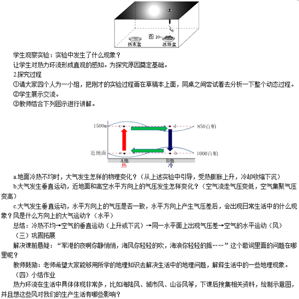 复习导入。通过复习上节课三圈环流是在不考虑海陆分布和地形影响下的理想模式,而实际上地球表面是存在海洋、陆地分布和地形起伏等不均匀的表面,引导学生思考在不同的陆地表面会出现什么样的现象呢?从而导入新课。