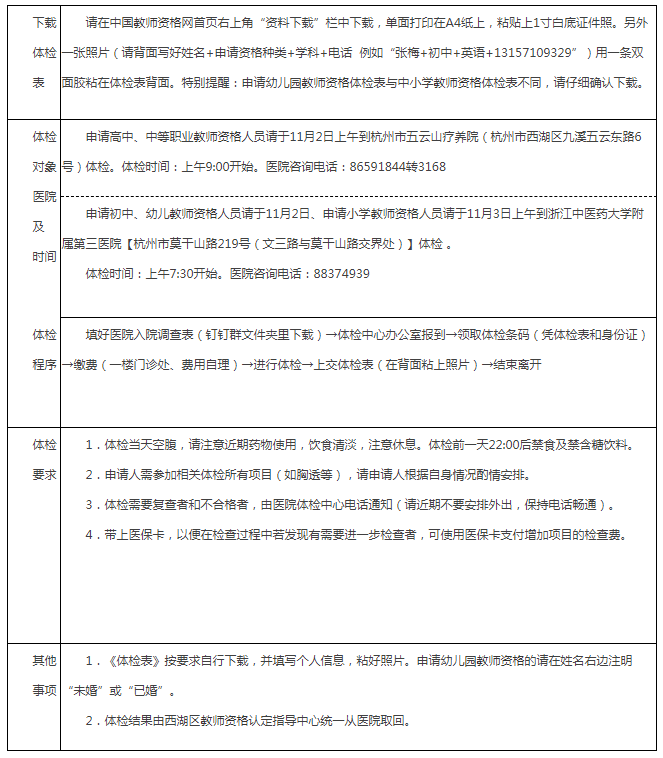 在西湖区申请初中教师、幼儿园教师资格证认定的申请人请于11月2日上午到浙江中医药大学附属第三医院【又称浙江省中山医院,杭州市莫干山路219号(文三路与莫干山路交界处)】进行体检。