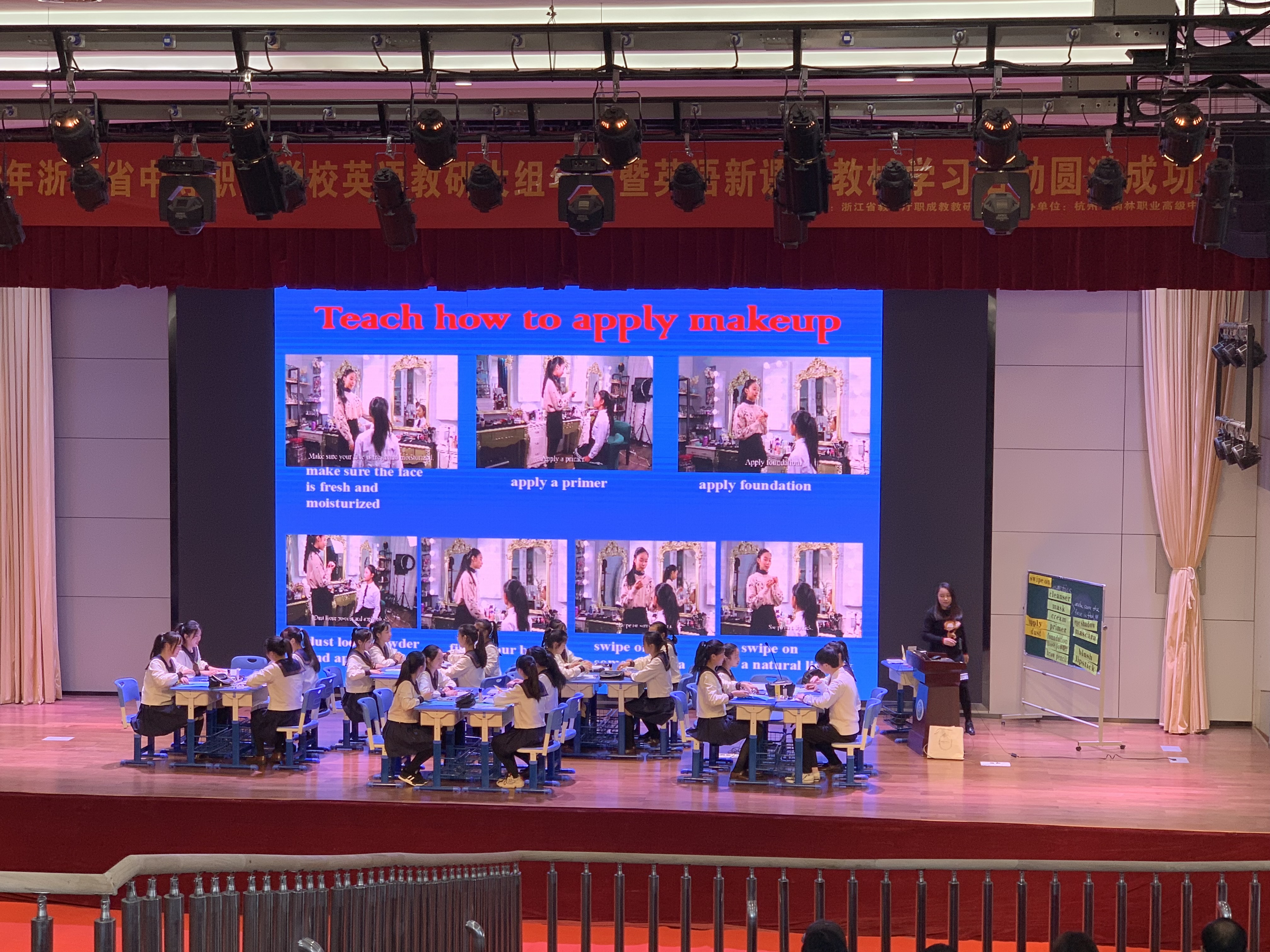 第二节课由温州市平阳二职的张璋老师进行展示,主题为《行动英语》中的Cosmetics。张老师利用信息化手段辅助教学,采用现场实物和图片视频相结合的方式让学生掌握化妆品的英文表达。同时学生分组合作,现场化妆并进行PK,做到了课堂知识与生活的有效结合,效果明显,让人印象深刻。