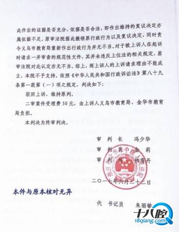 2016年11月17日,该案在金华市婺城区法院开庭审理,当天的庭审持续了将近两个小时。义乌市教育局副局长、金华市教育局副局长分别出庭。