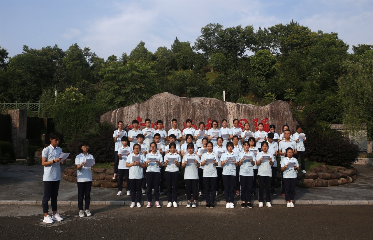 高一(1)班班主任吴章秋组织学生走出教室,在学校的校训石旁以集体诵读英雄革命家书的形式致敬英雄,在朗朗书声走进英雄的内心深处,感受英雄的信仰;