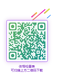 2.体检流程:考生在中国教师资格网首页“资料下载”栏中或扫描下方二维码下载体检表,用黑色或蓝色水笔填写好身份证号码、姓名、性别、出生年月、既往病史等五项内容,同时,准备两张2寸彩色证件照(必须与网报上传照片一致),一张证件照贴在体检表上,一张(背面写上姓名+档案号,档案号体检当天领取)于体检报到时交给工作人员,照片将用于教师资格证。