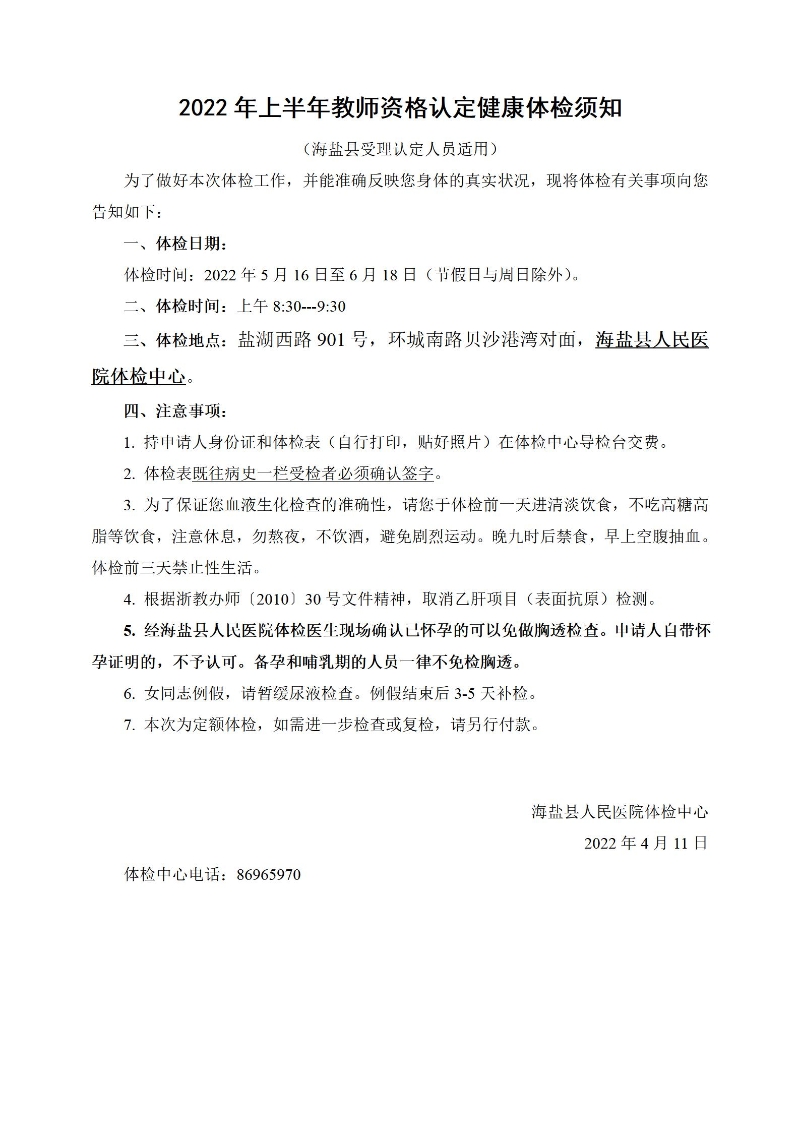 贴上照片后,在规定的时间内按体检须知(可查看下方图片)要求带上身份证至海盐县人民医院体检中心进行体检,体检结束后,按医院通知时间及时领回《体格检查表》及报告单,在现场确认时带到现场提交给认定机构。《体格检查表》上必须要有体检结论、主检医师签字以及医院盖章,体检不合格者不能认定教师资格。申请人员必须按照规定的时间、指定的医院、规定的项目和规定的要求进行体格检查。