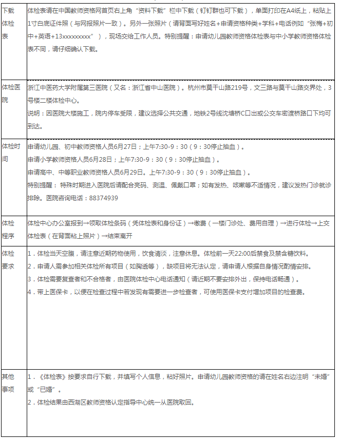 (二)凡符合杭州市高中教师、中等职业学校教师、中等职业学校实习指导教师资格认定条件的申请人,不需要到认定点现场办理和提交材料,可以向杭州市任何一个区的认定机构提出申请,并且到所选的区指定的体检医院体检。【注:西湖区的高中体检安排是6月29日上午7:30到浙江中医药大学附属第三医院(又称浙江省中山医院,杭州市莫干山路219号)进行体检。】