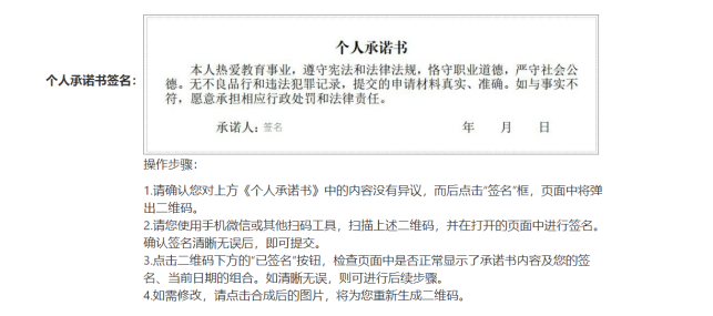 2.申请人应据实填写《个人承诺书》并对承诺内容负责,承诺如与事实不符,各级教育行政部门将依据国家相关法律法规,按“弄虚作假骗取教师资格”对申请人作出“撤销教师资格、五年内不得重新取得教师资格”或“丧失教师资格,不得重新申请认定教师资格”的行政处罚。
