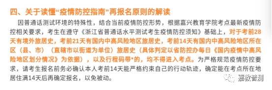 5.凡违反“就近就便”报名原则,擅自从外地市报名至嘉兴教育学院考点者,出现因防疫受制而无法参加测试等情况,考点有权视其为弃考处理,不再另行安排测试。报名原则可详见本公众号或嘉兴教育学院网站《3月22日报名前的最新友情提醒》,或阅读下方截图: