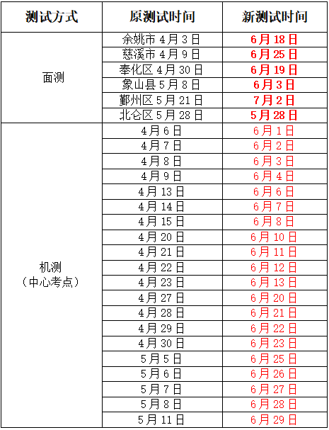 根据最新疫情发展态势,为满足广大考生测试需求,现决定测试时间更改至6月,详见下表。测试地点改至丰柏街7号(通途路与翠柏路交叉口西北侧),具体是否进行测试,详见5月28日公告内容。如因测试时间调整导致考生不能参加测试的,上半年测试结束后,可申请退费,详见后续公告内容。