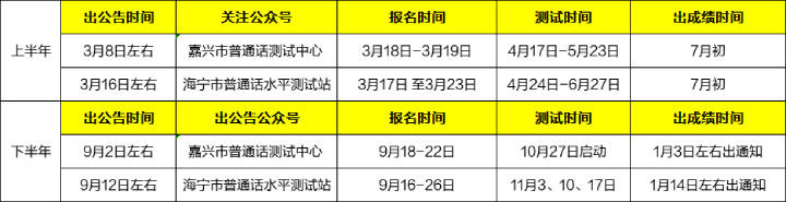 嘉兴普通话水平测试一般每年举行2次,上下半年各一次。具体时间详见表格: