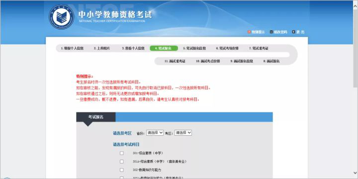 照片上传完成后即可开始教师资格证考试正式报名,进行选择考区、报考学段、报考科目等操作。